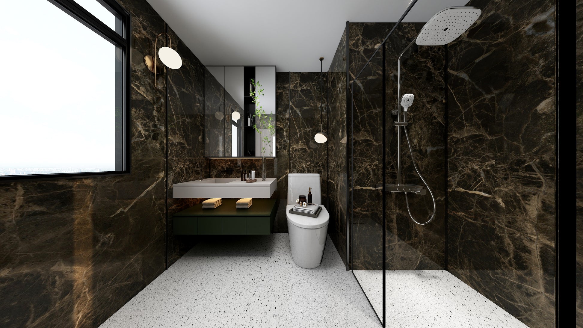 Say goodbye to black mouldy groutings in your bathroom walls. Every The Wall composite slabs covers the full height from floor to ceiling, 100% waterproof, high stain resistance, washing bleach-proof.