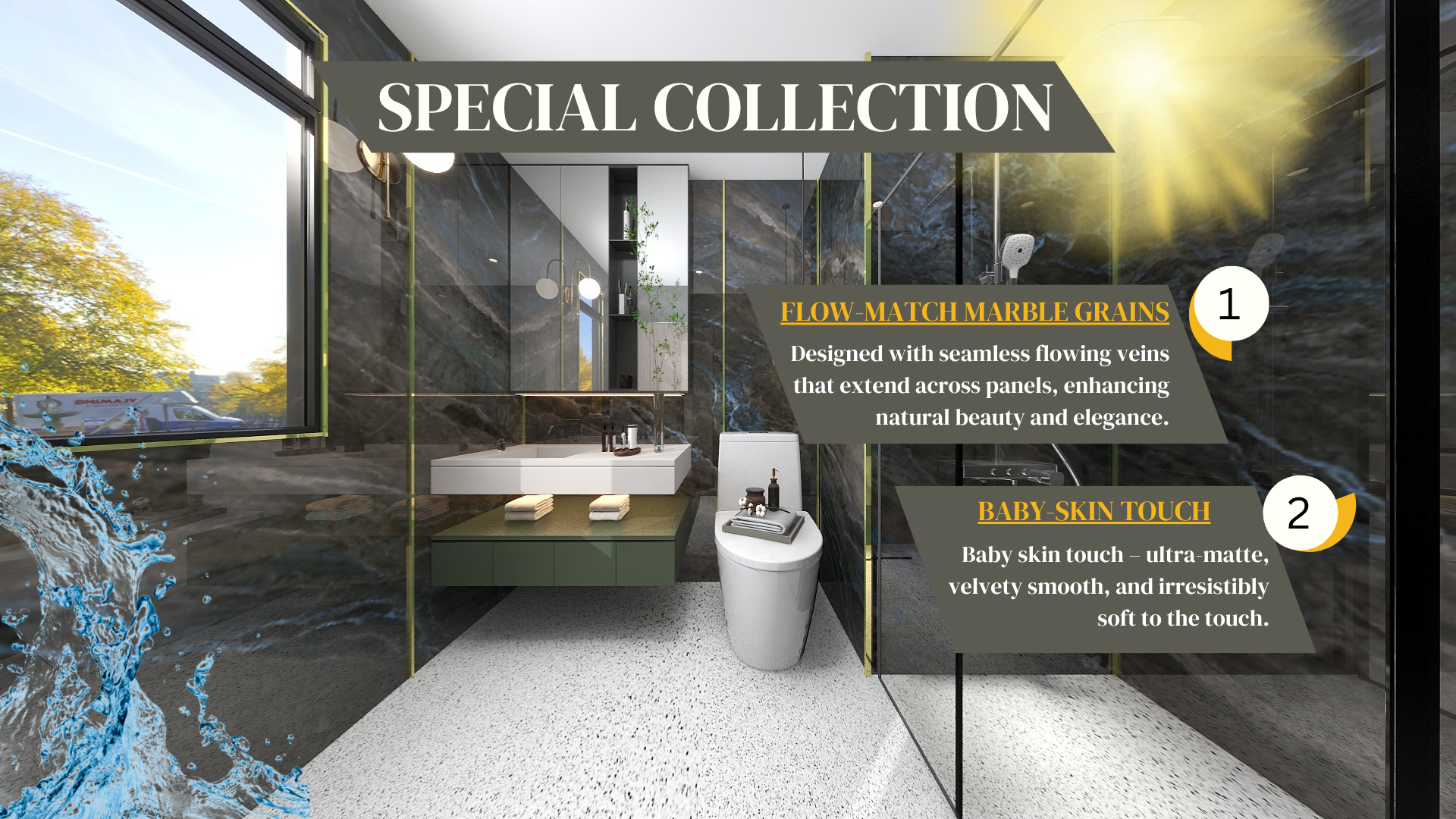 Our latest collection redefines elegance and craftsmanship with flow-matched marble grains—each slab is carefully designed to align seamlessly with the adjoining, creating the look of continuous, natural marble veins across your walls. The result is a luxurious, high-end aesthetic typically associated only with premium finishes.