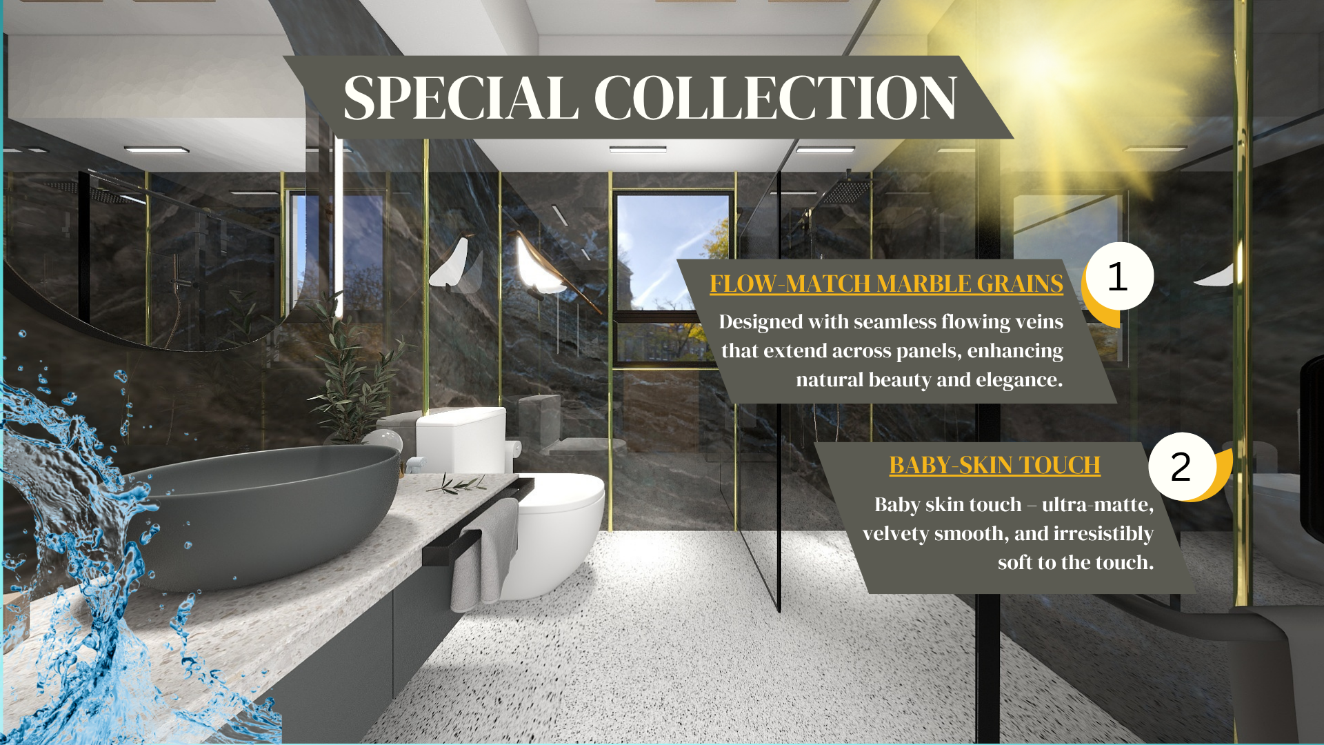 Our latest collection redefines elegance and craftsmanship with flow-matched marble grains—each slab is carefully designed to align seamlessly with the adjoining, creating the look of continuous, natural marble veins across your walls. The result is a luxurious, high-end aesthetic typically associated only with premium finishes.