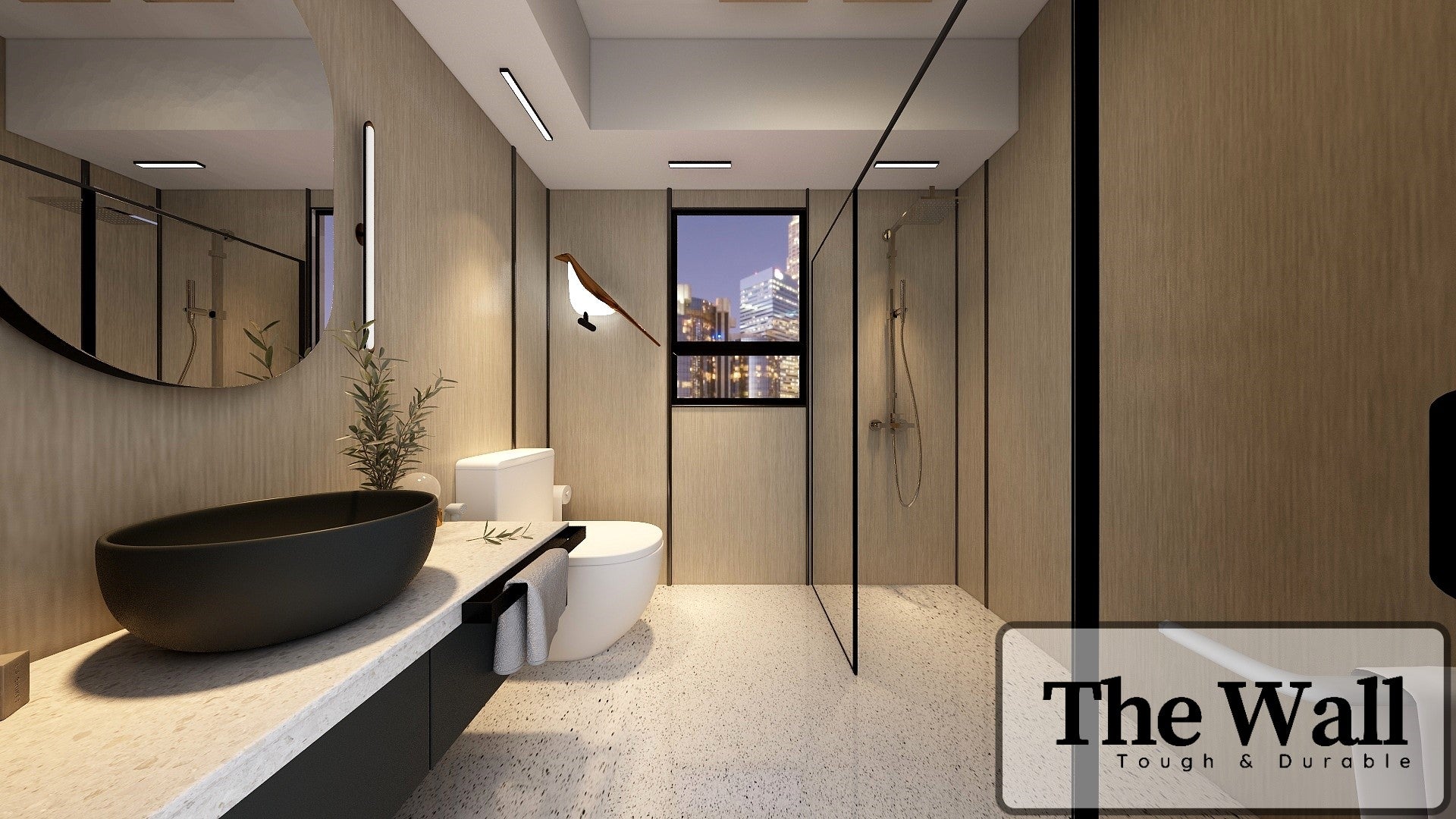 Say goodbye to black mouldy groutings in your bathroom walls. Every The Wall composite slabs covers the full height from floor to ceiling, 100% waterproof, high stain resistance, washing bleach-proof.