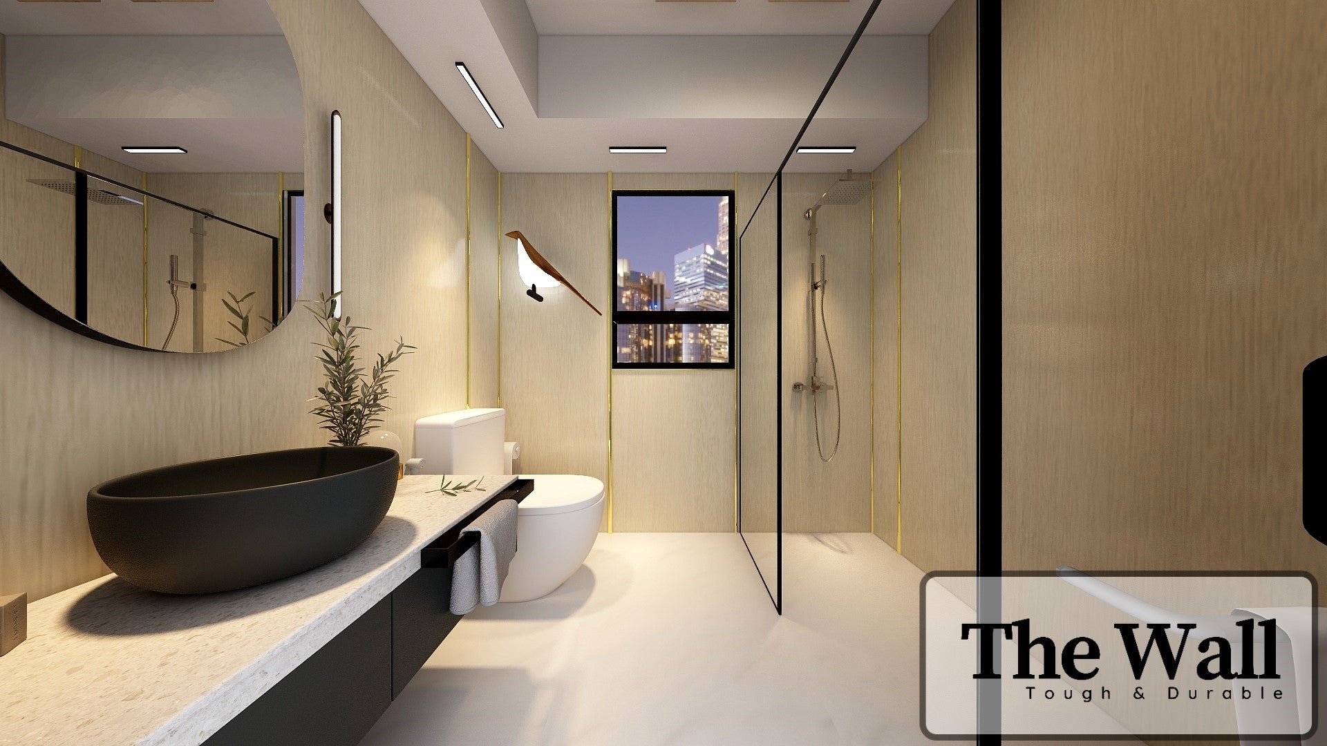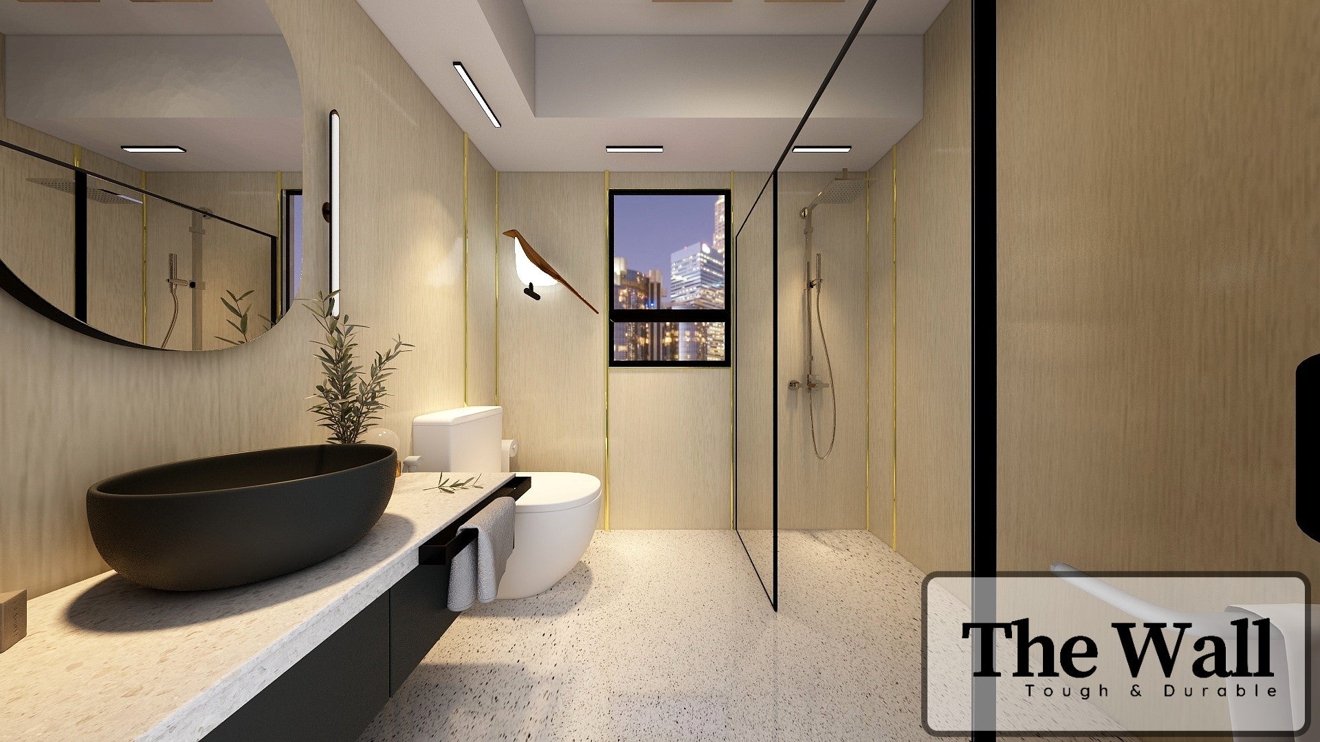The Wall are a composite slabs manufactured under extreme environments, under high pressures of up to 700,000kgf/mยฒ and temperatures of 220ยฐC. Thus achieving the perfect equilibrium of tensile strength, density and durability to withstand wet area usage like bathroom walls.