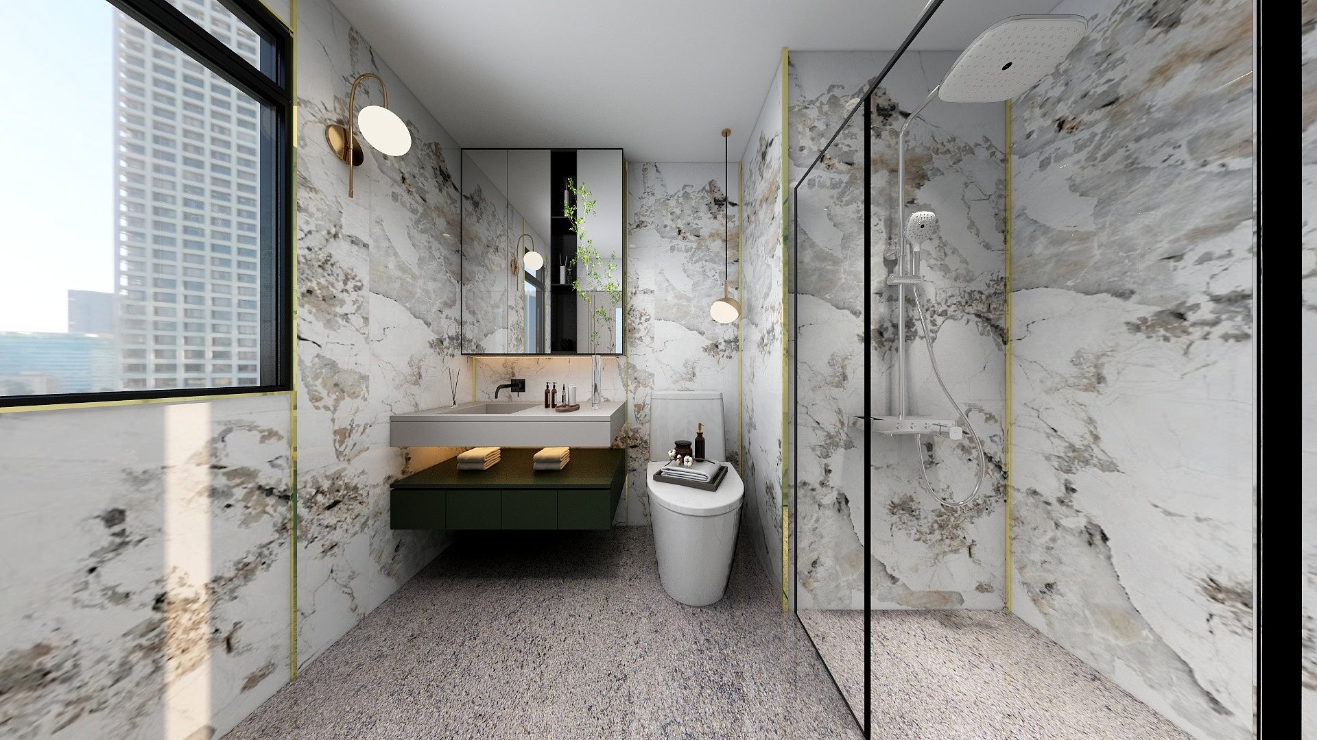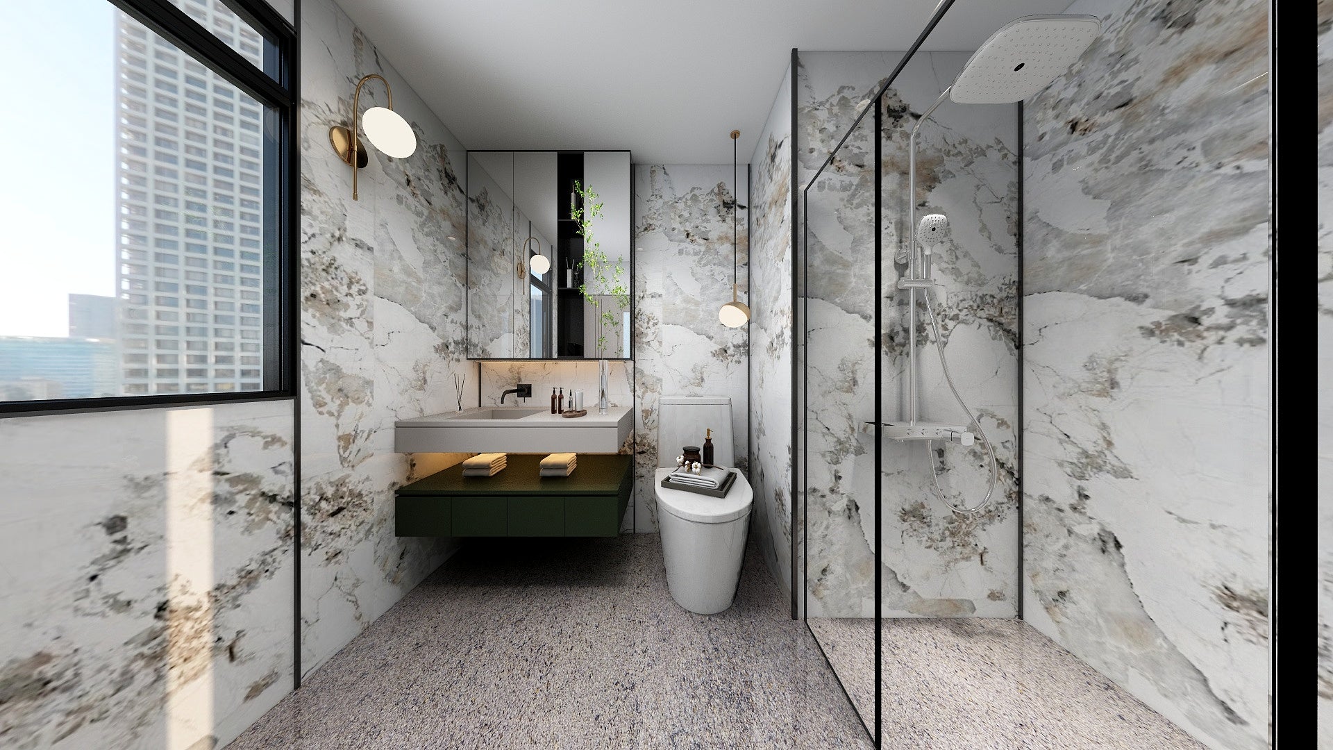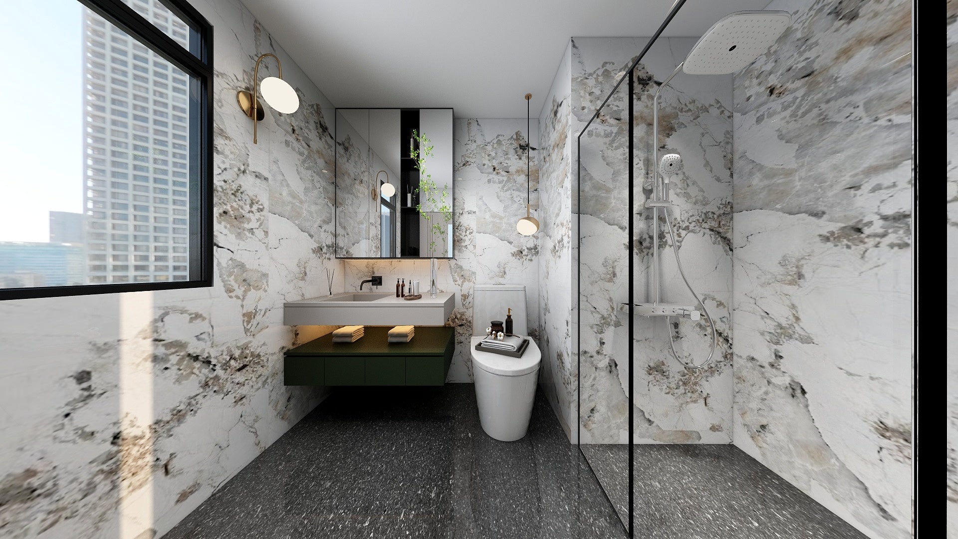 The Wall are a composite slabs manufactured under extreme environments, under high pressures of up to 700,000kgf/mยฒ and temperatures of 220ยฐC. Thus achieving the perfect equilibrium of tensile strength, density and durability to withstand wet area usage like bathroom walls.