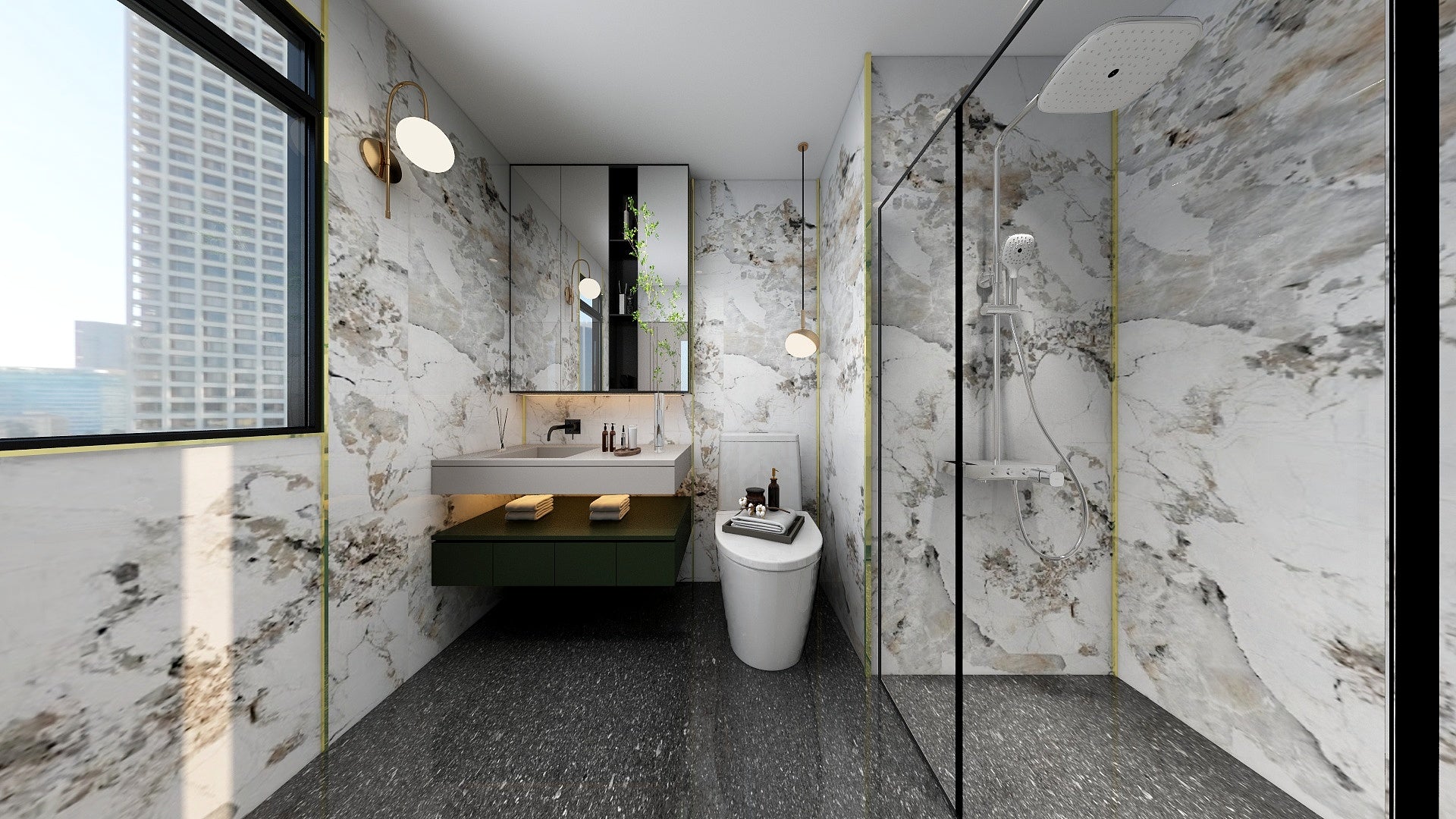 Say goodbye to black mouldy groutings in your bathroom walls. Every The Wall composite slabs covers the full height from floor to ceiling, 100% waterproof, high stain resistance, washing bleach-proof.ย