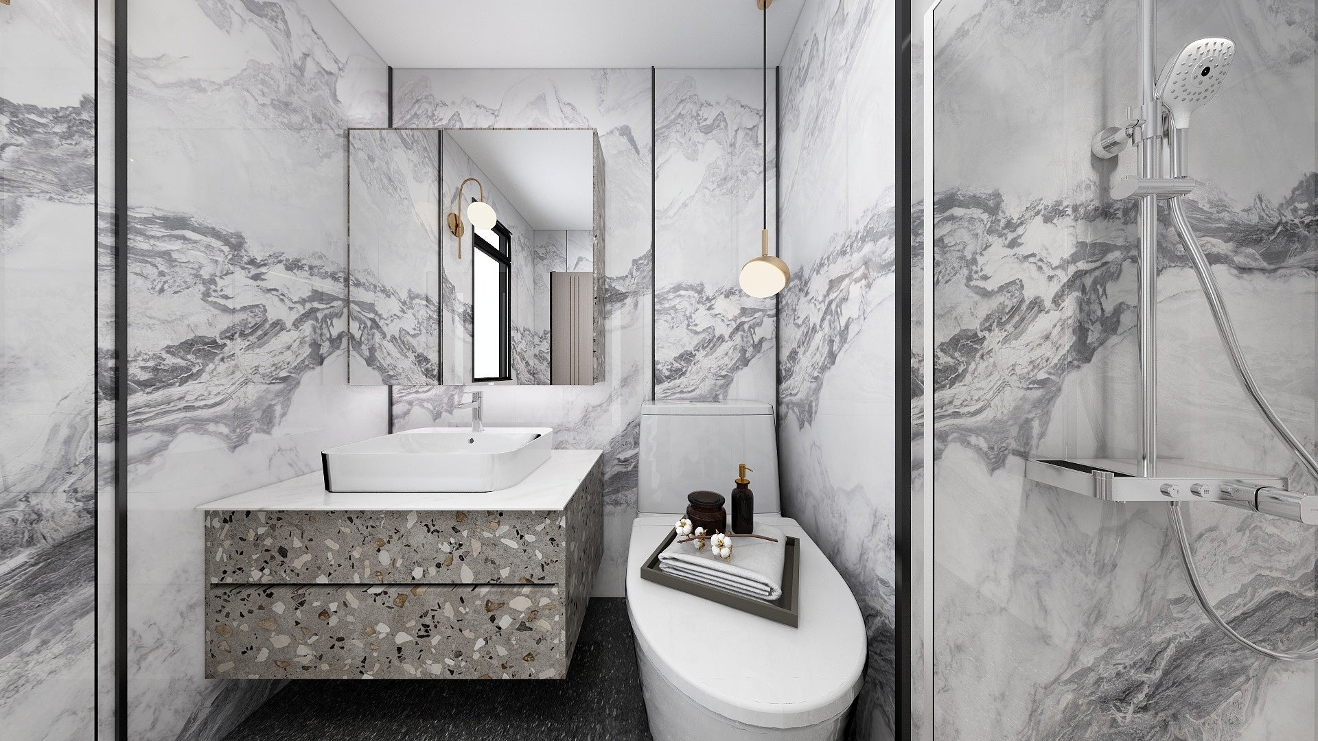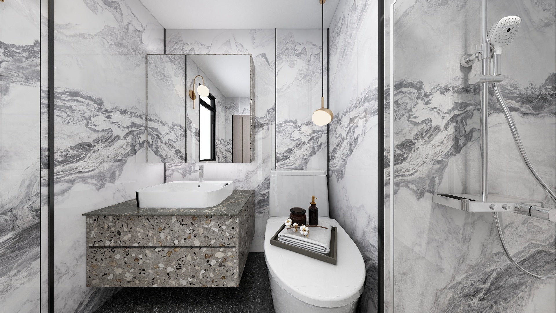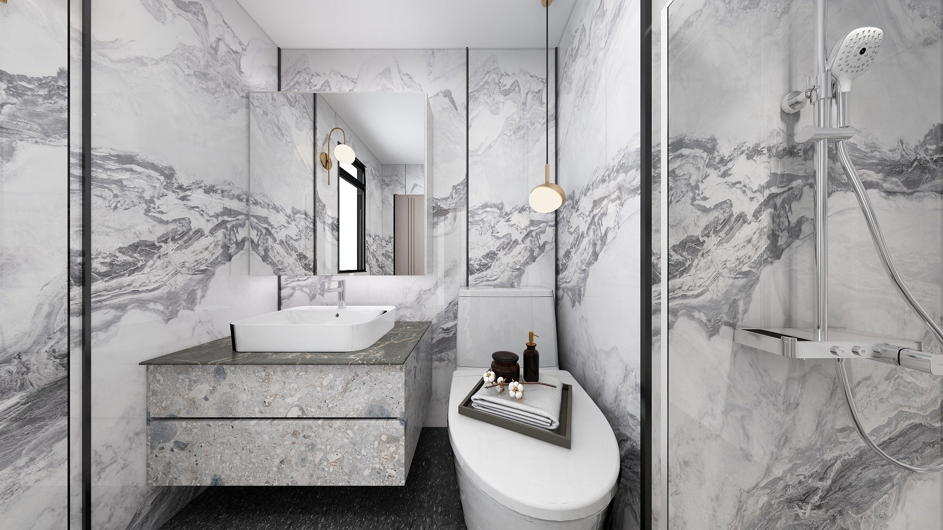 The Wall are a composite slabs manufactured under extreme environments, under high pressures of up to 700,000kgf/m² and temperatures of 220°C. Thus achieving the perfect equilibrium of tensile strength, density and durability to withstand wet area usage like bathroom walls.