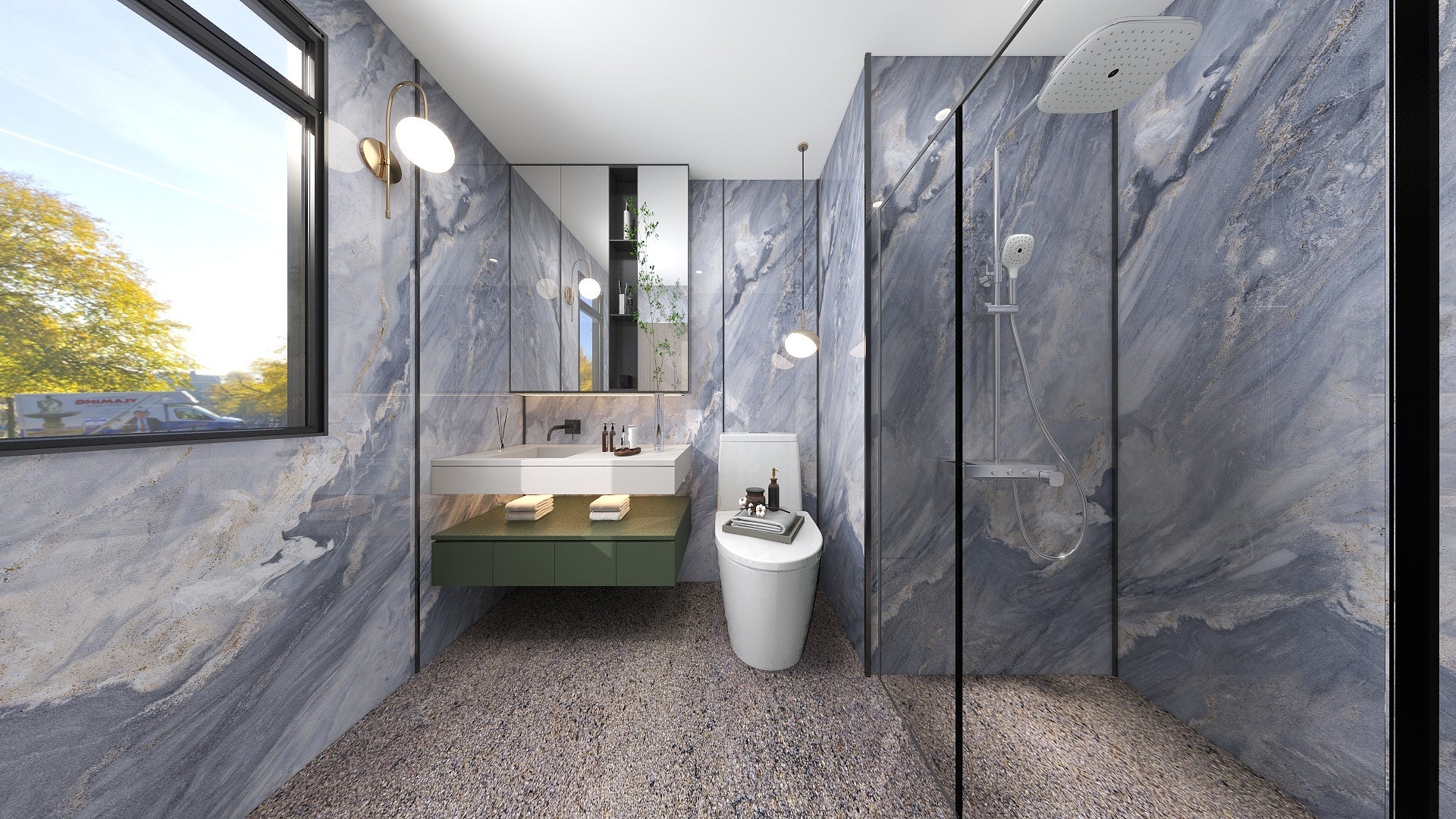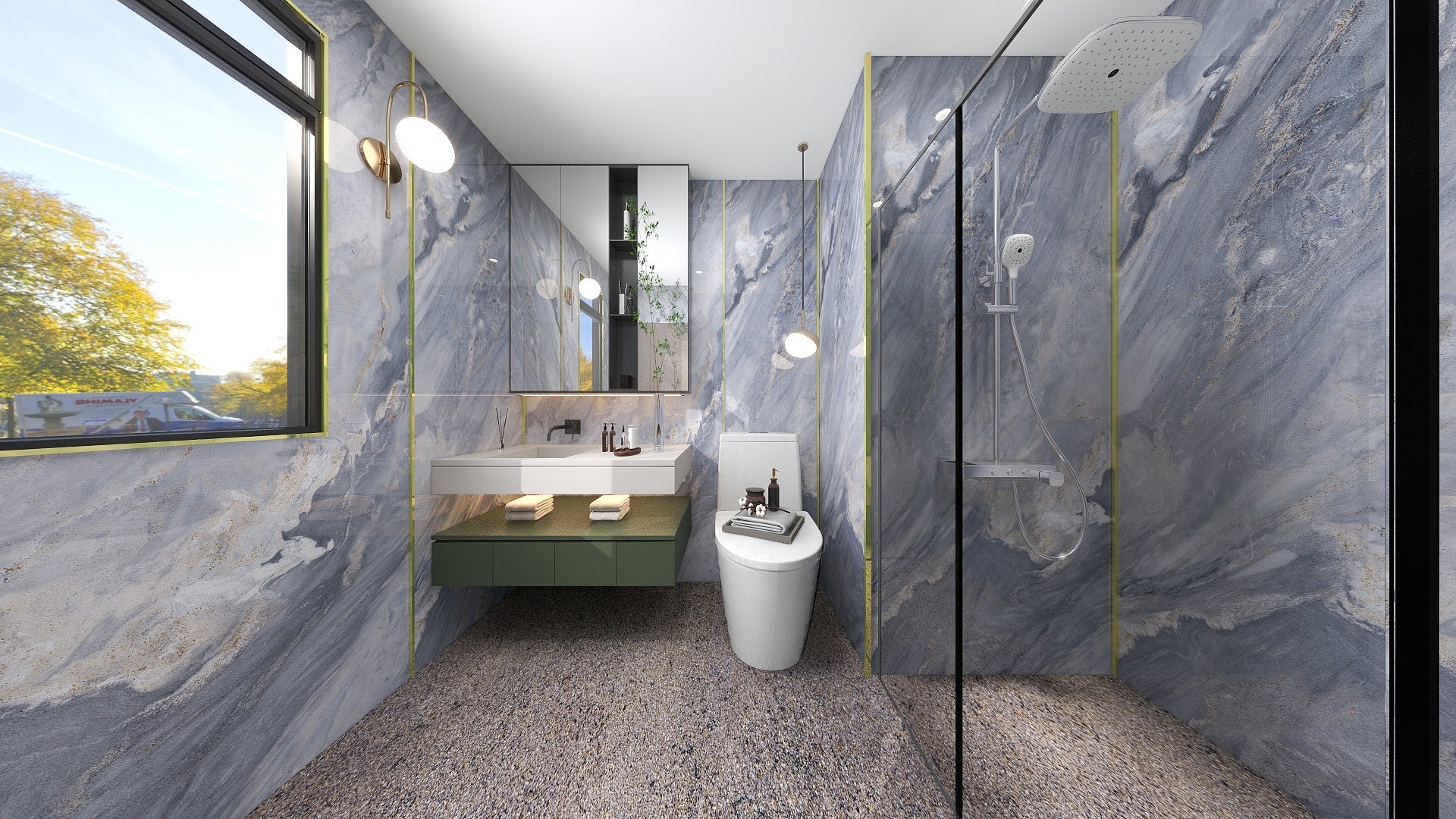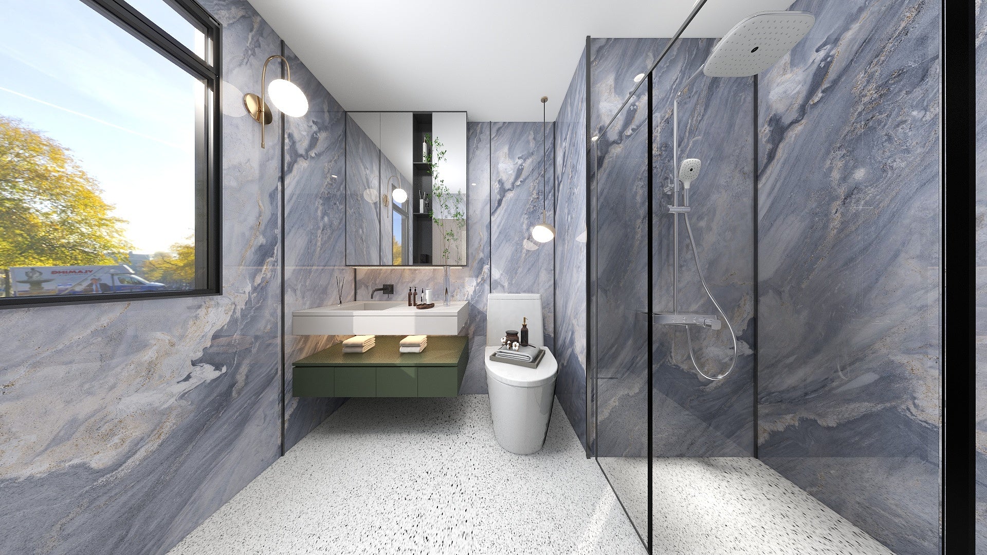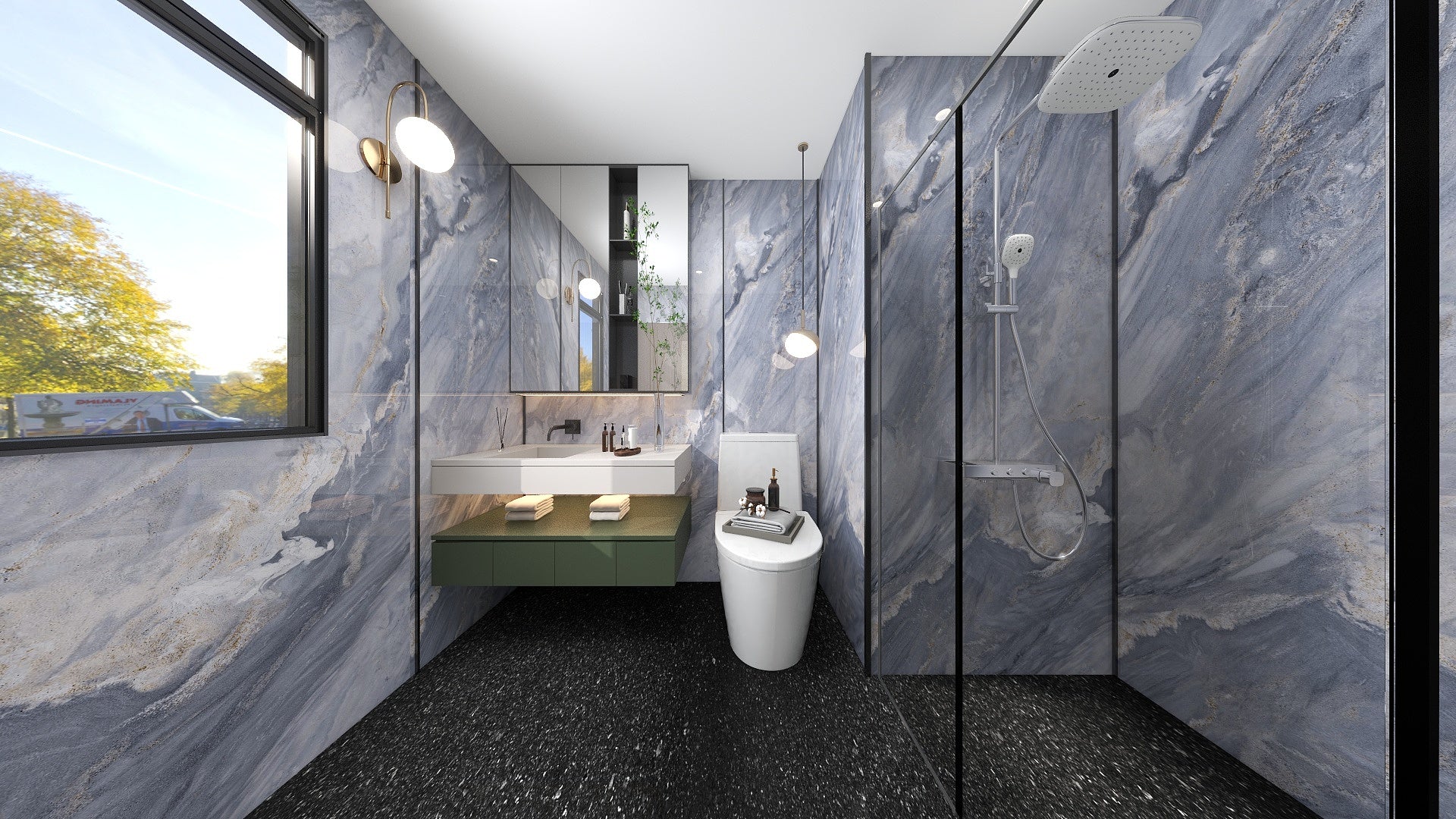 Say goodbye to black mouldy groutings in your bathroom walls. Every The Wall composite slabs covers the full height from floor to ceiling, 100% waterproof, high stain resistance, washing bleach-proof.