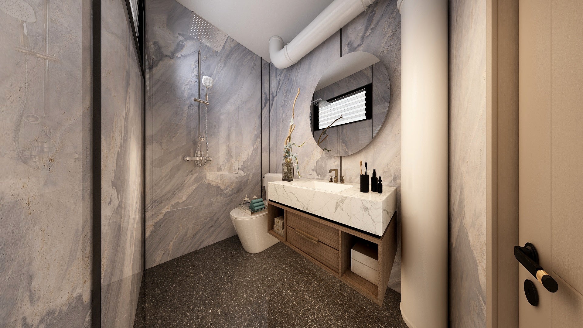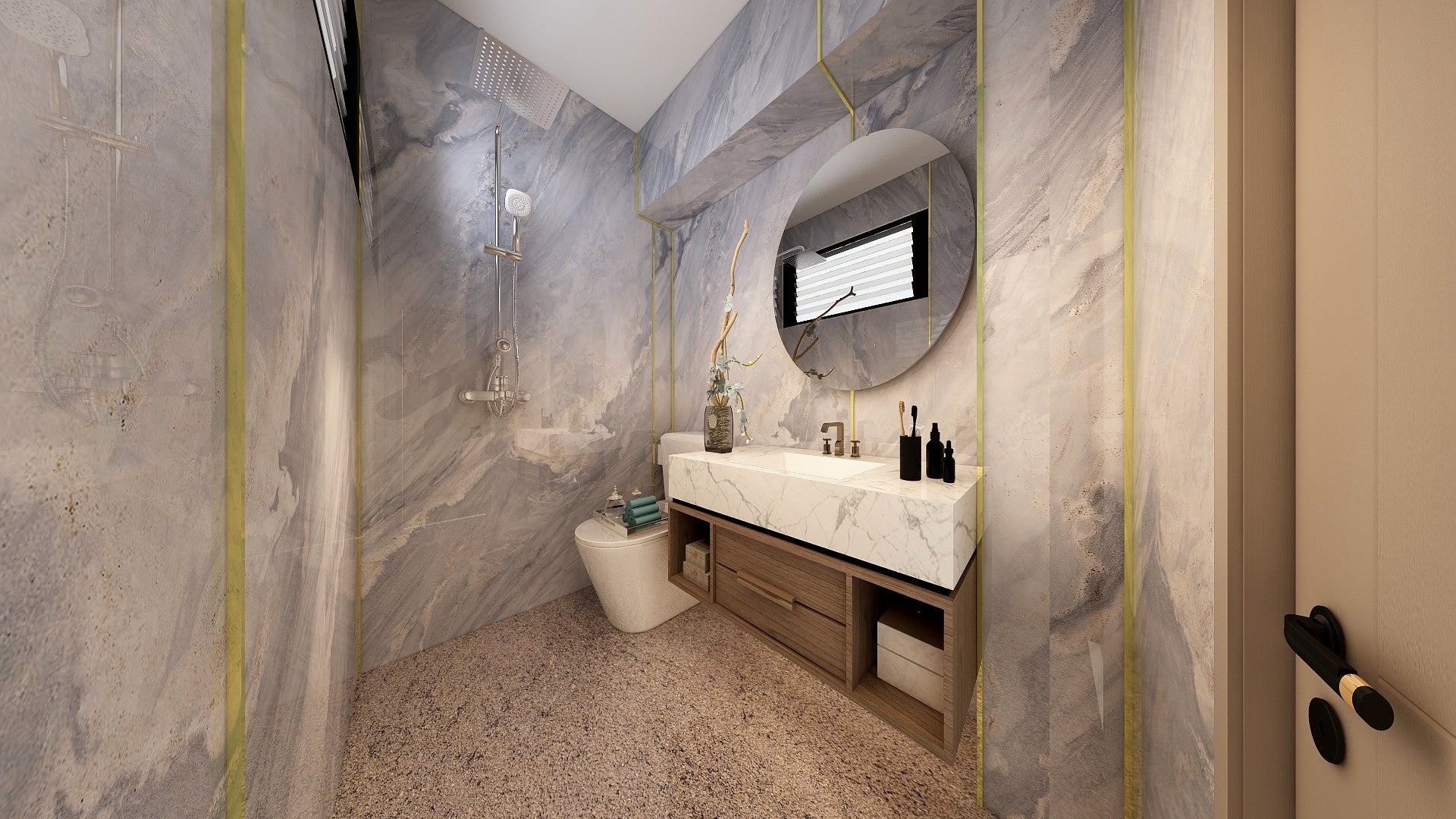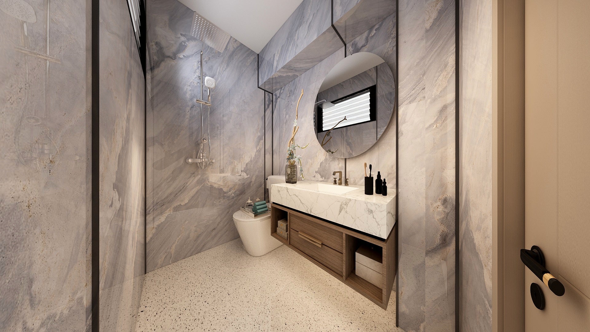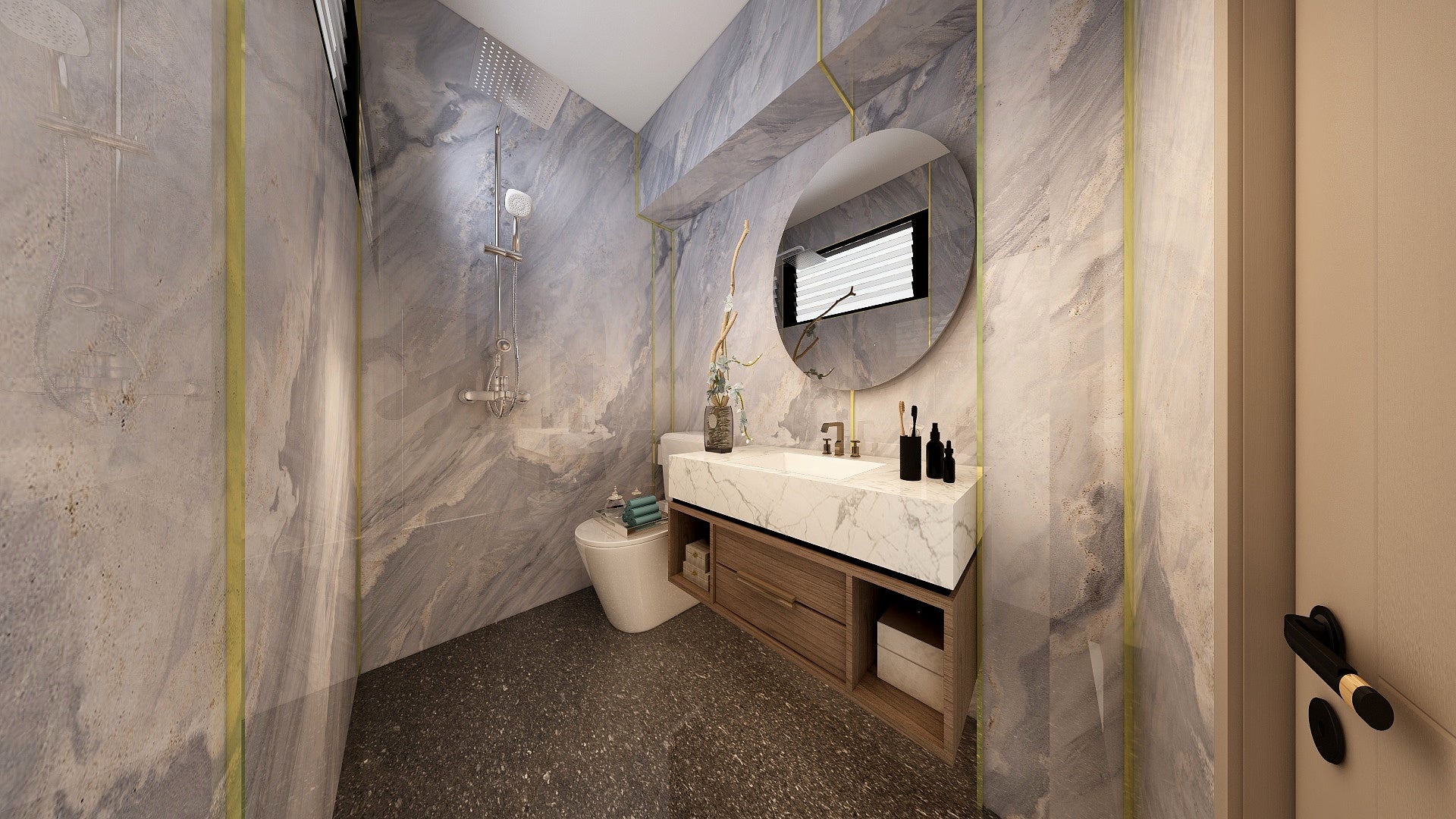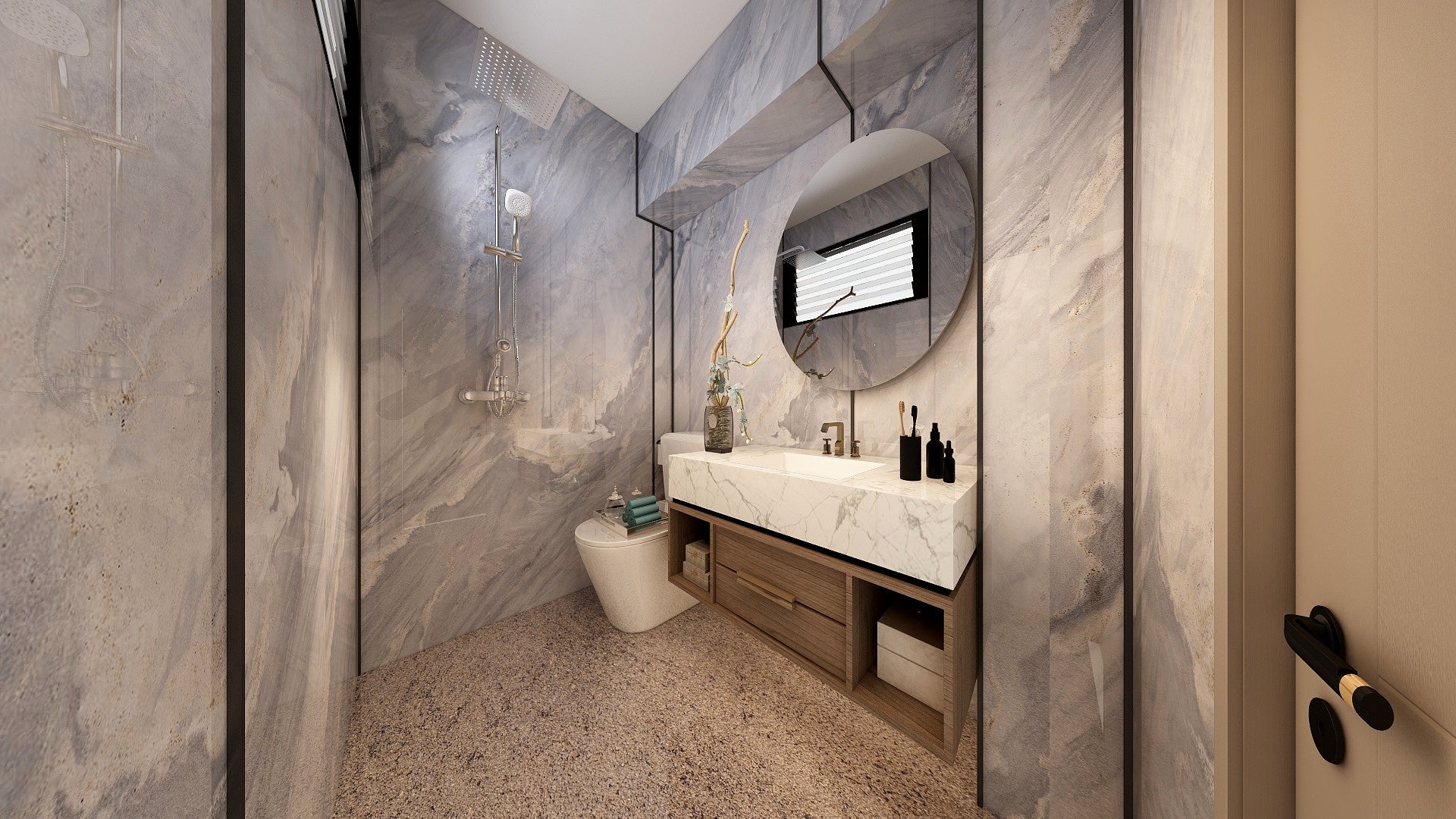 The Wall are a composite slabs manufactured under extreme environments, under high pressures of up to 700,000kgf/mΒ² and temperatures of 220Β°C. Thus achieving the perfect equilibrium of tensile strength, density and durability to withstand wet area usage like bathroom walls.