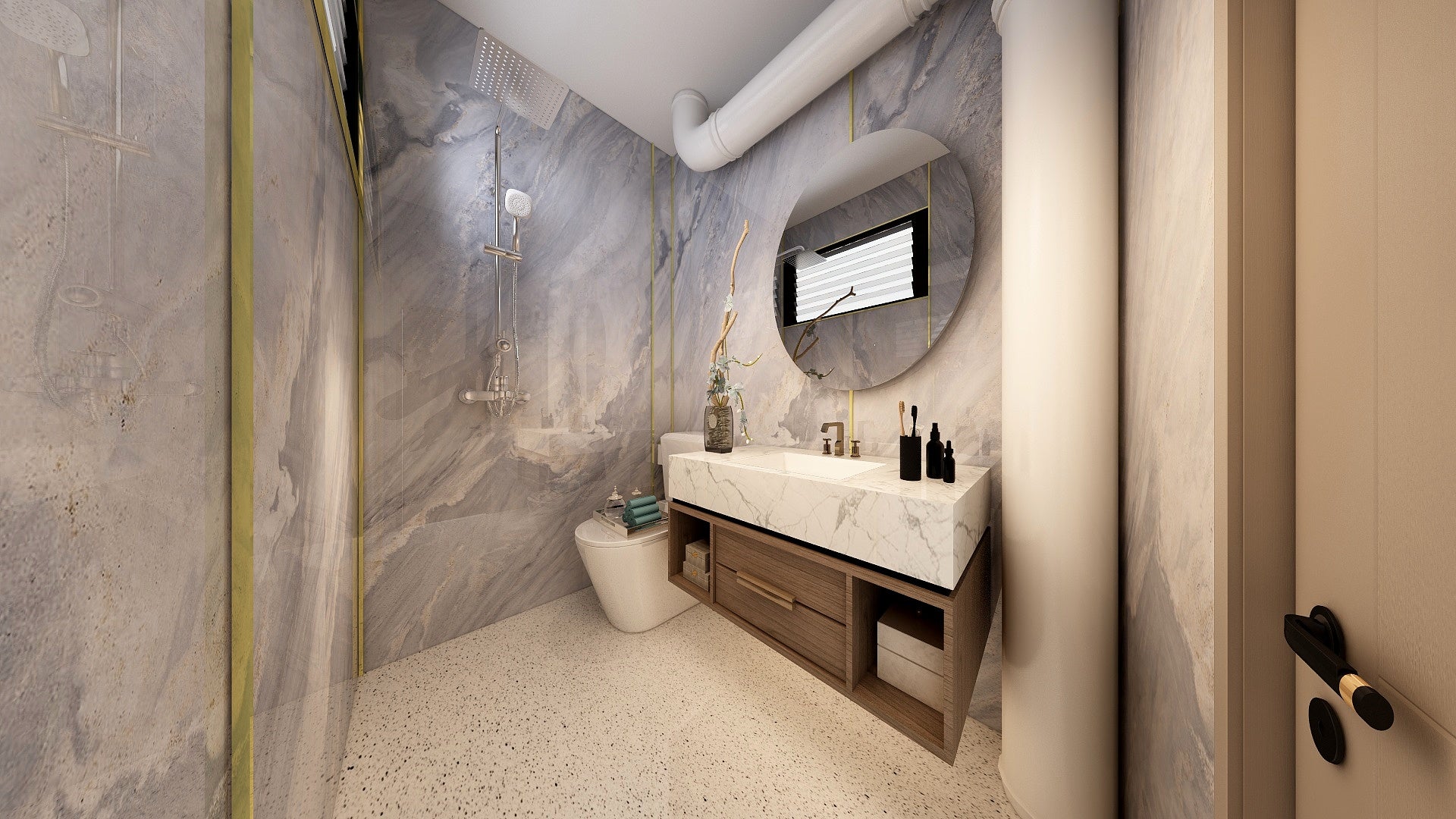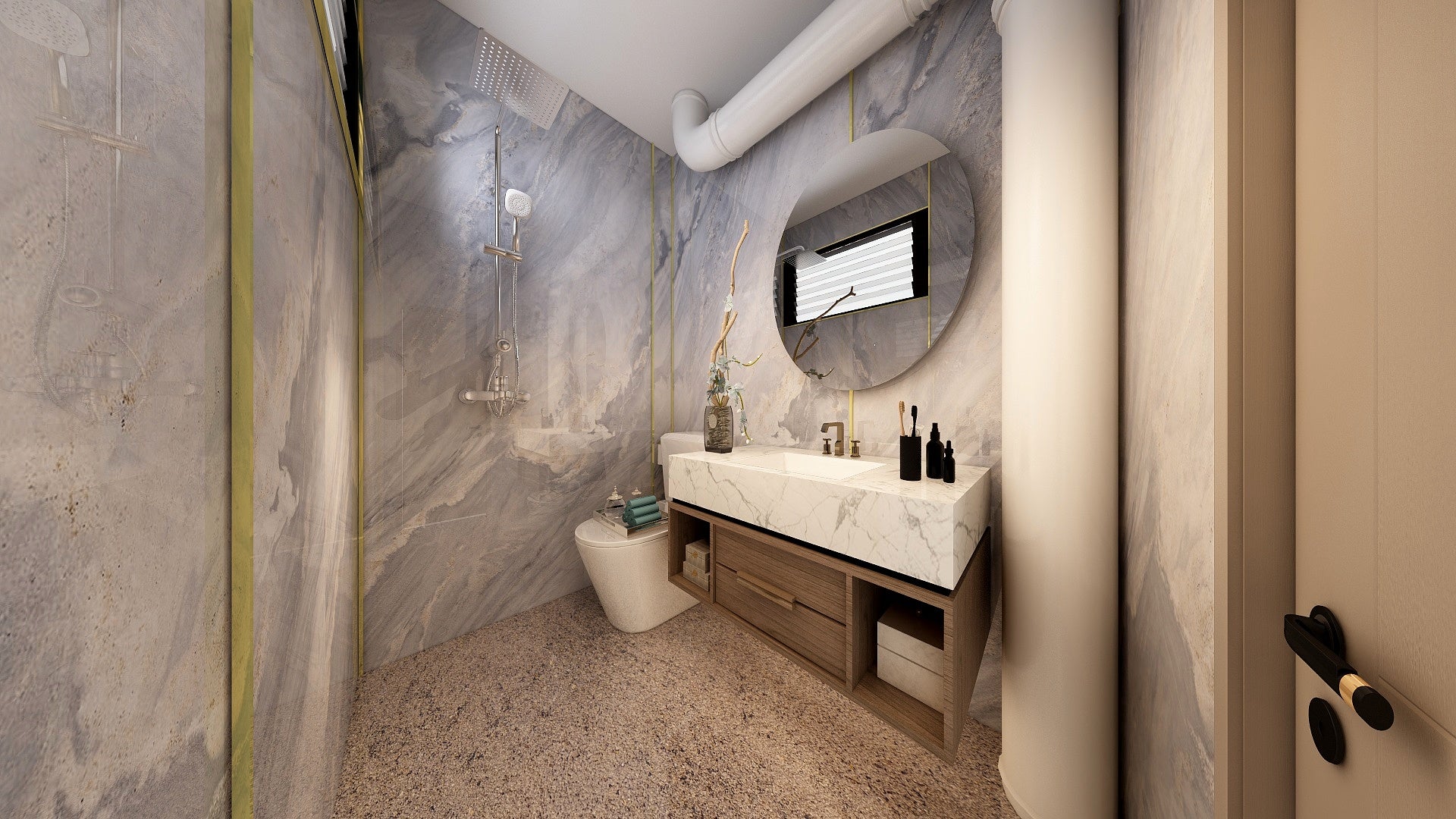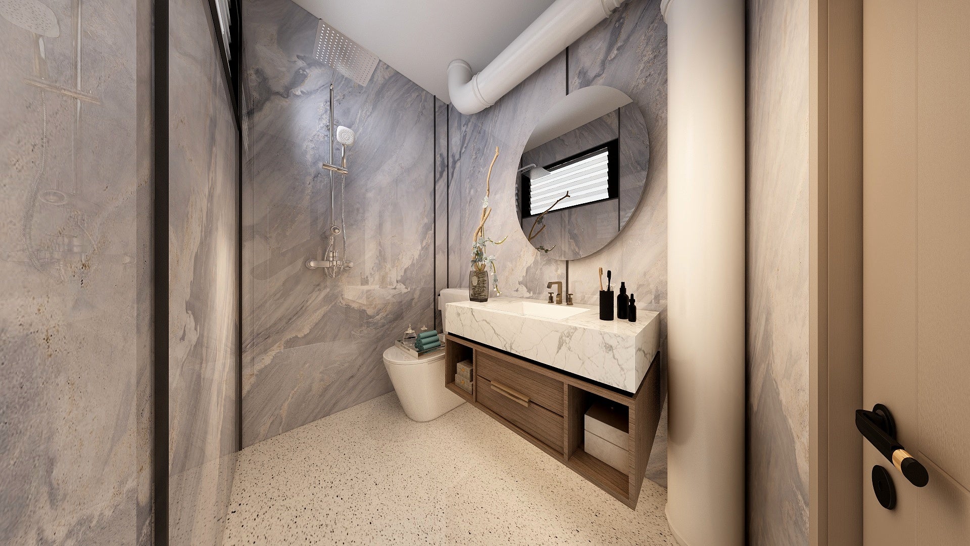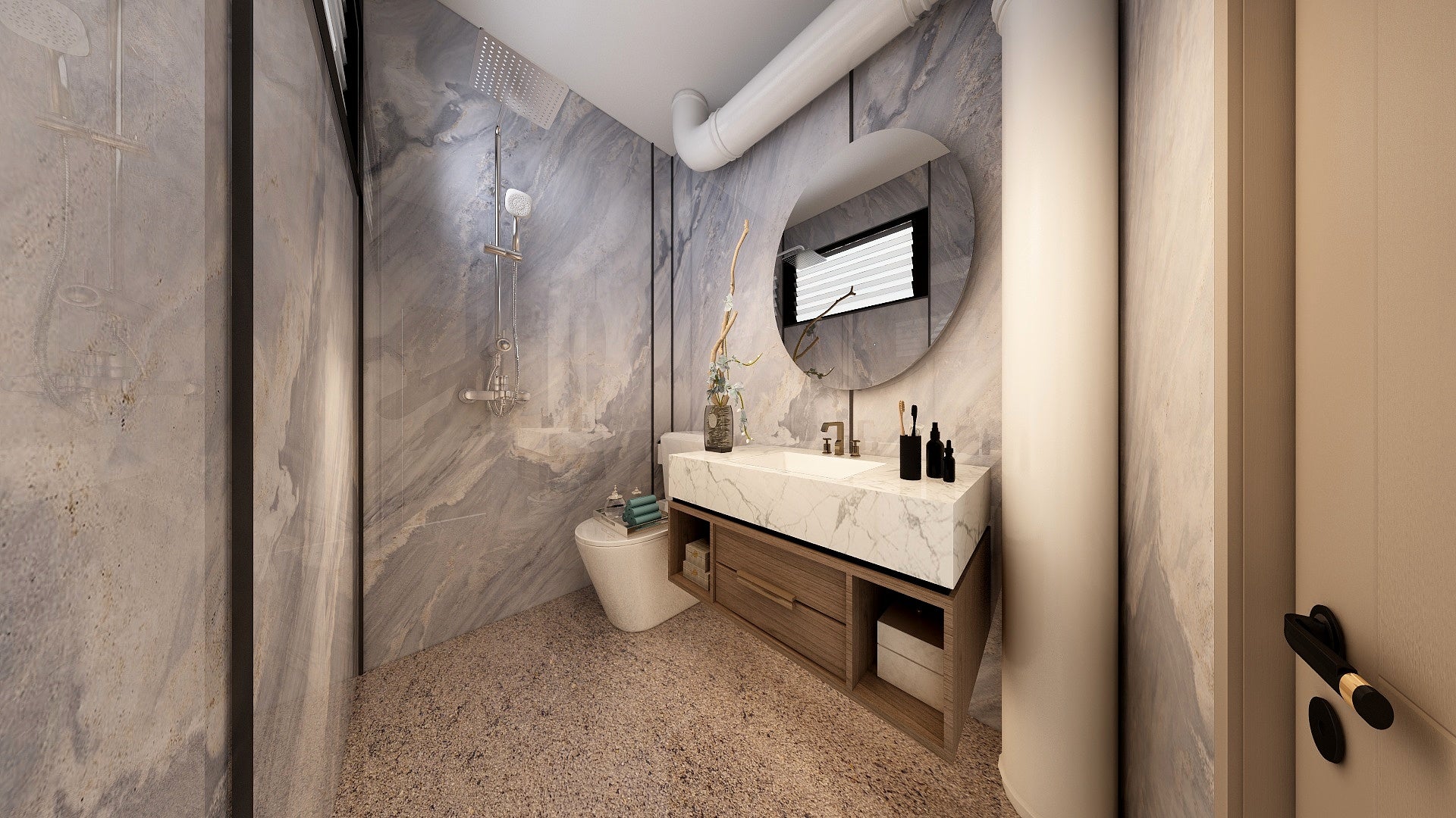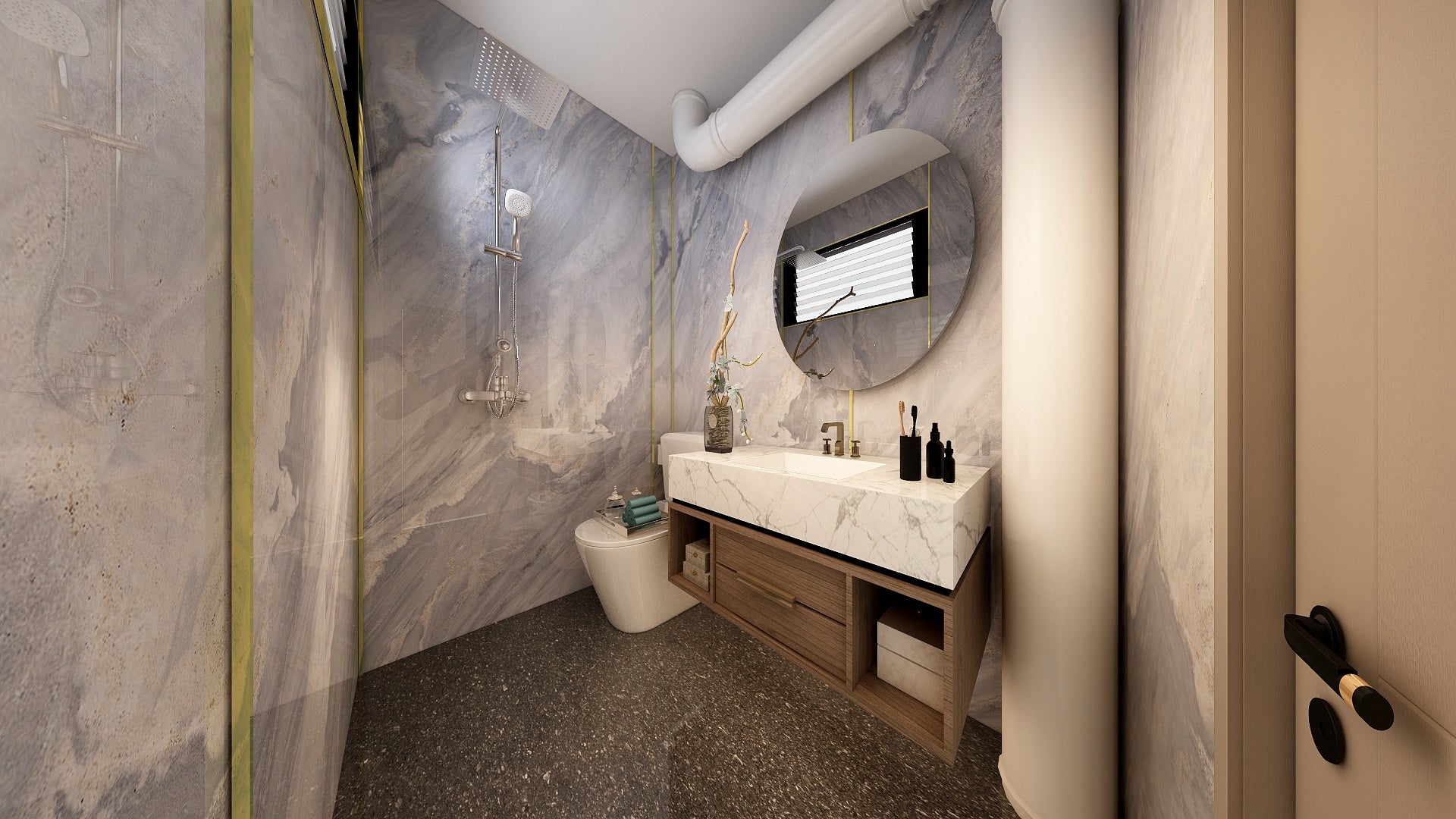 The Wall are a composite slabs manufactured under extreme environments, under high pressures of up to 700,000kgf/mΒ² and temperatures of 220Β°C. Thus achieving the perfect equilibrium of tensile strength, density and durability to withstand wet area usage like bathroom walls.