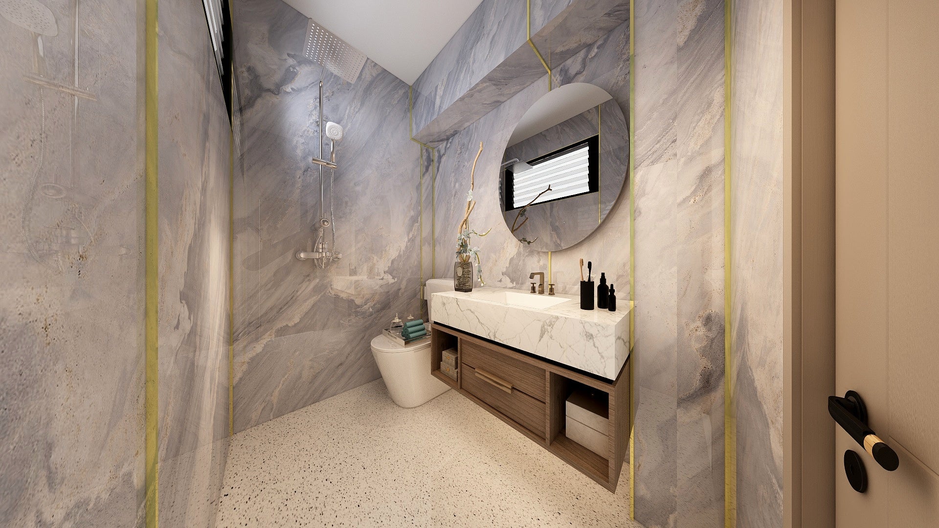 Say goodbye to black mouldy groutings in your bathroom walls. Every The Wall composite slabs covers the full height from floor to ceiling, 100% waterproof, high stain resistance, washing bleach-proof.Β
