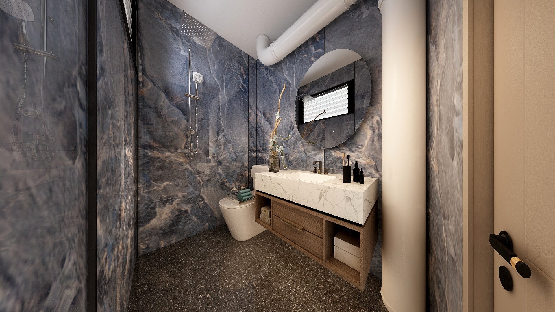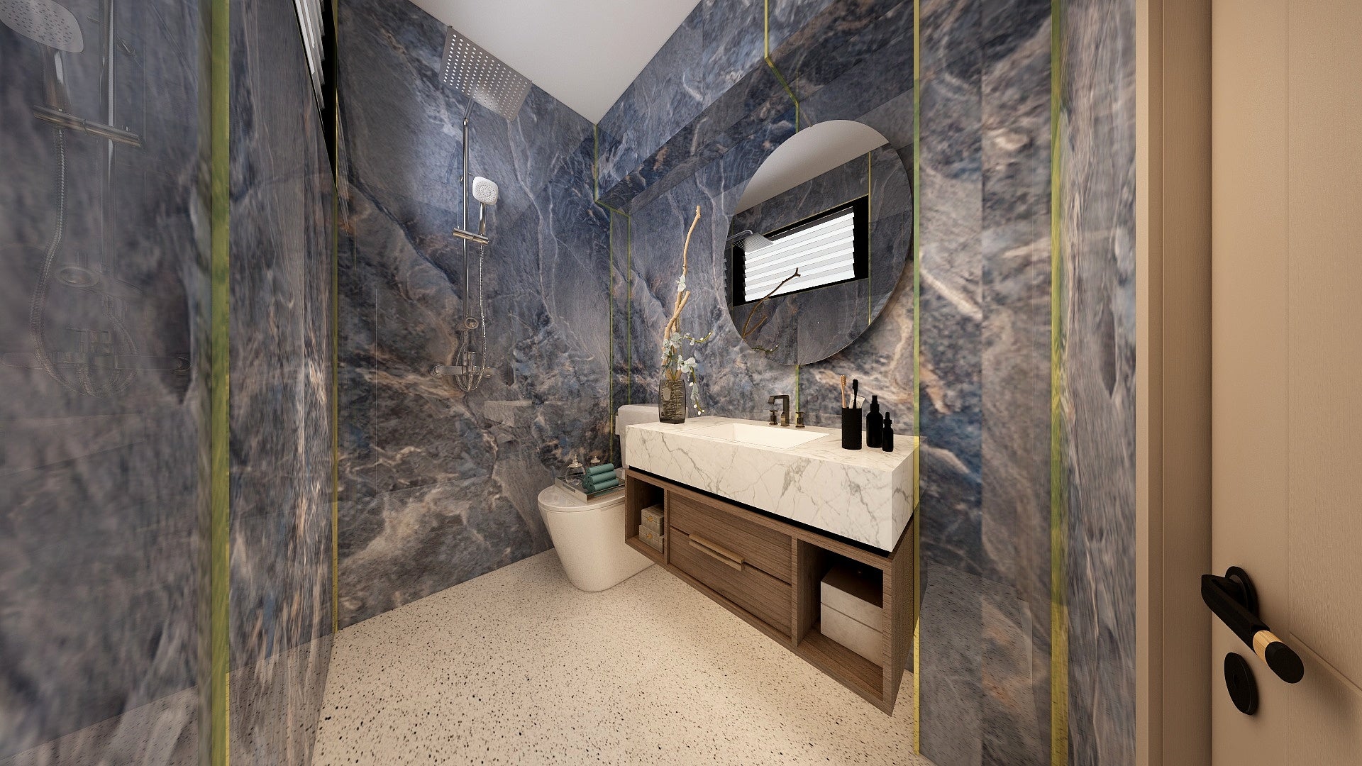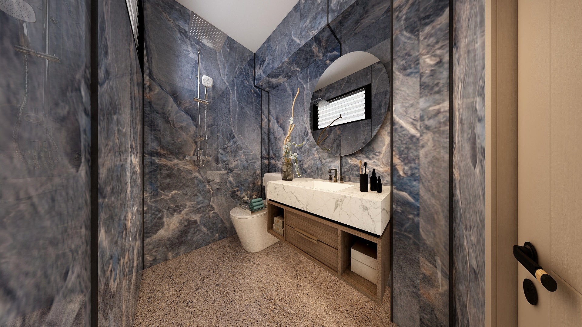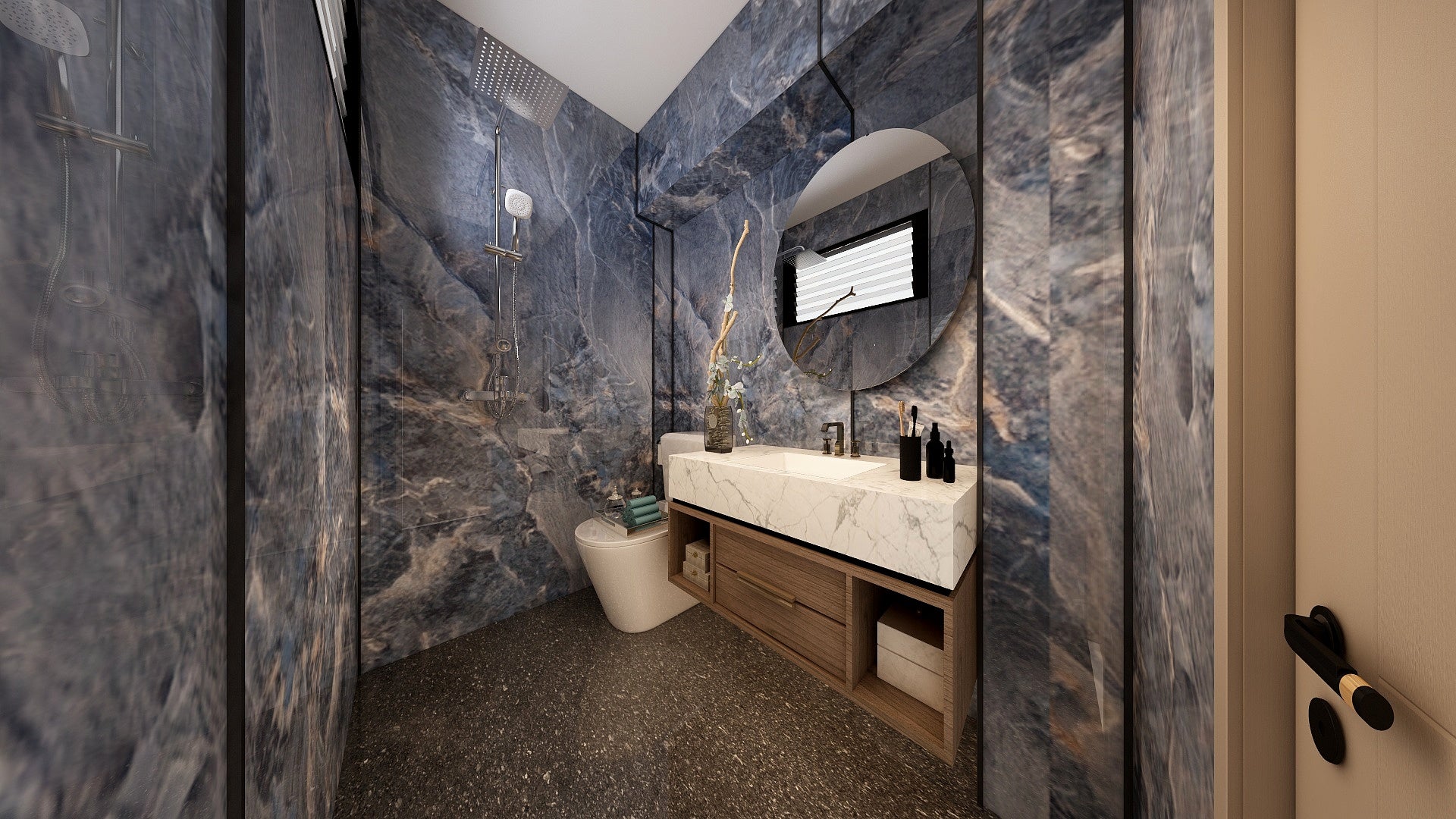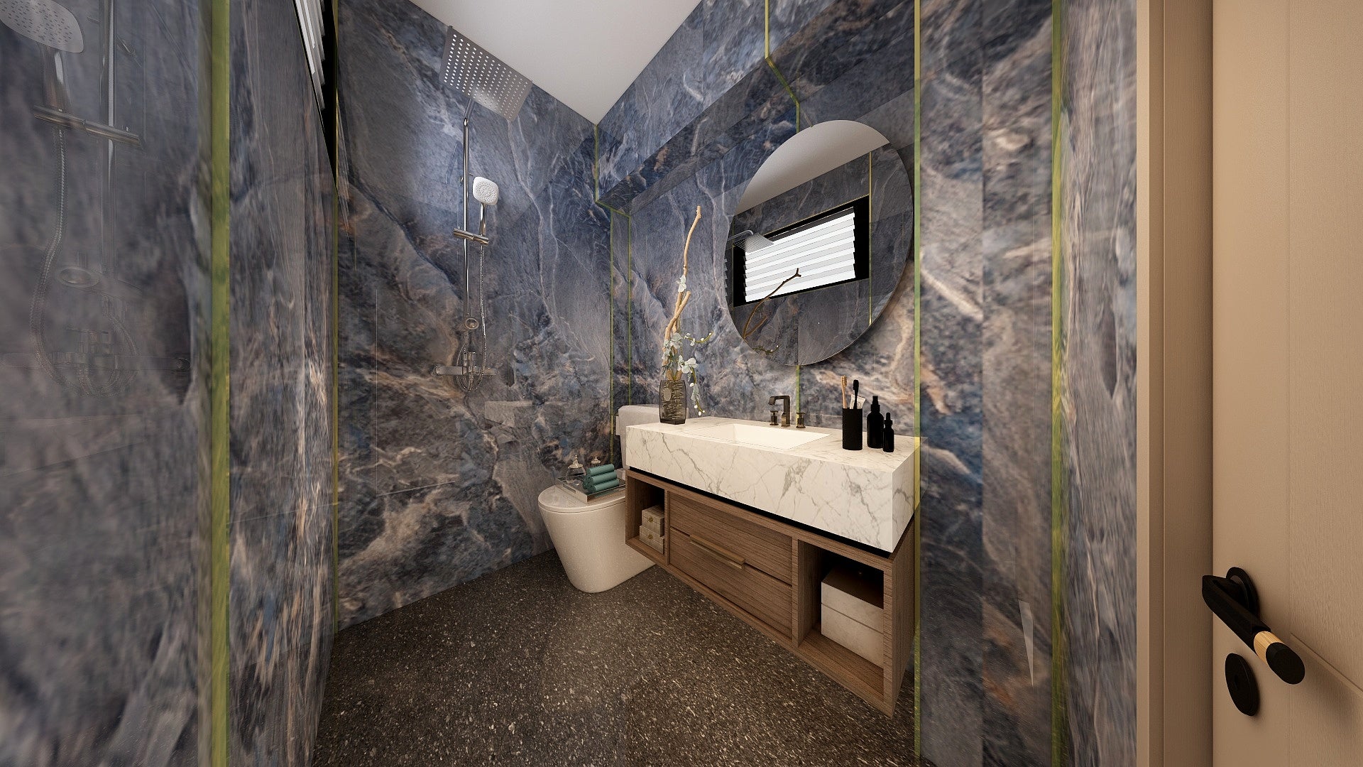The Wall are a composite slabs manufactured under extreme environments, under high pressures of up to 700,000kgf/mΒ² and temperatures of 220Β°C. Thus achieving the perfect equilibrium of tensile strength, density and durability to withstand wet area usage like bathroom walls.