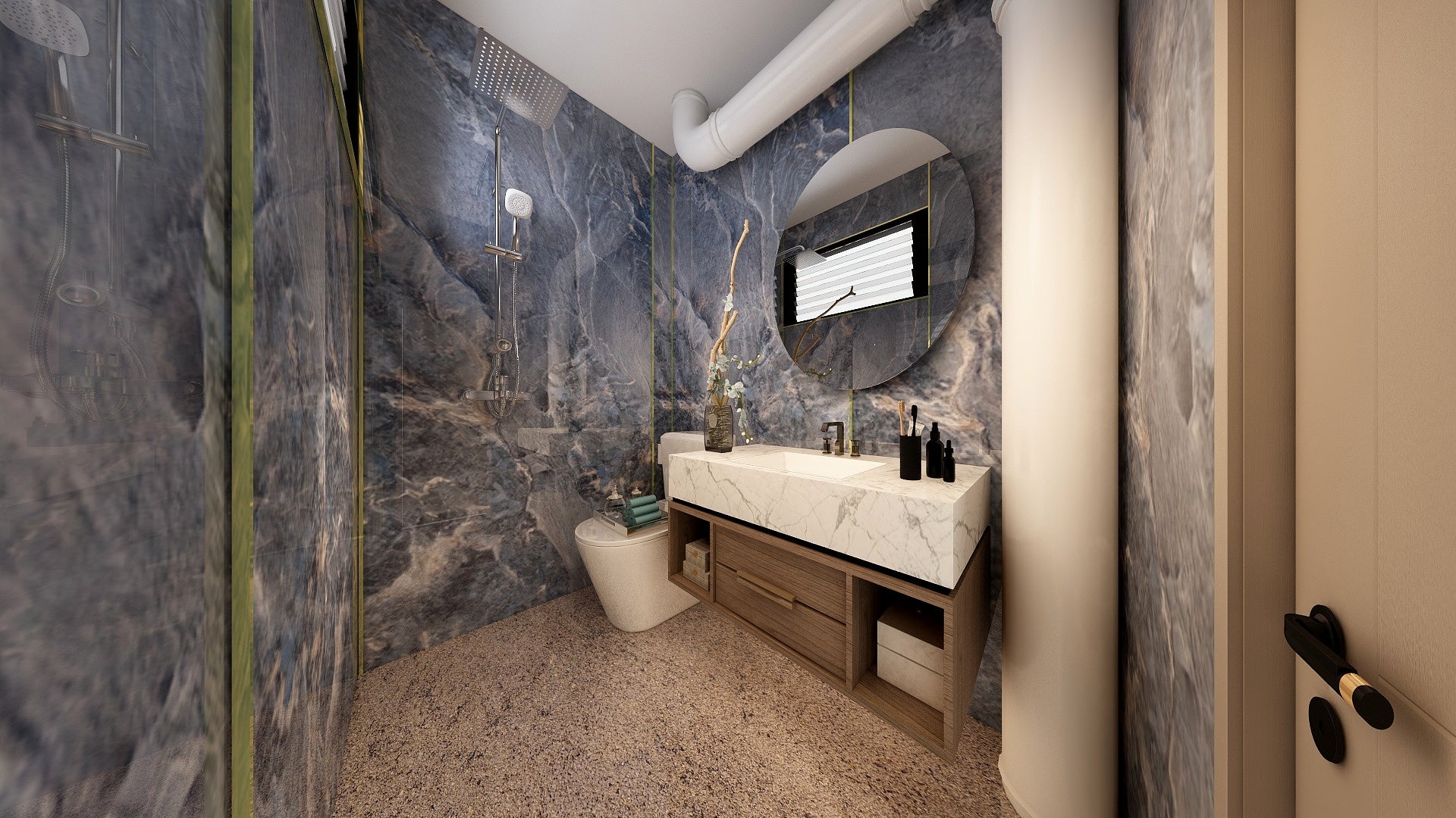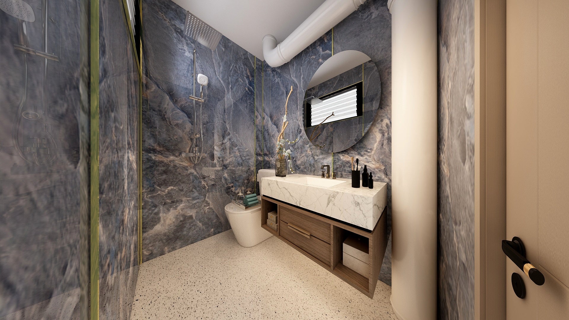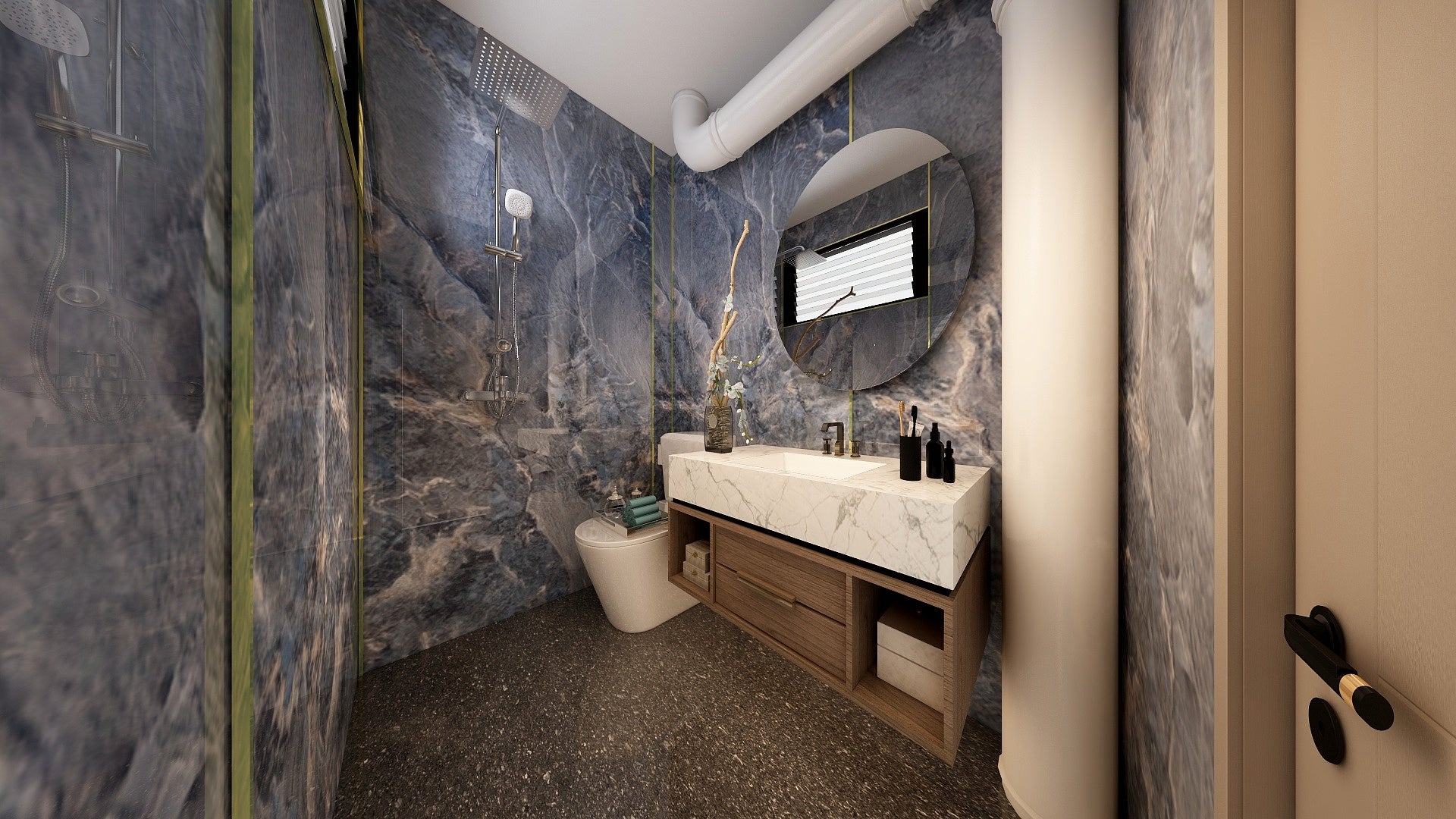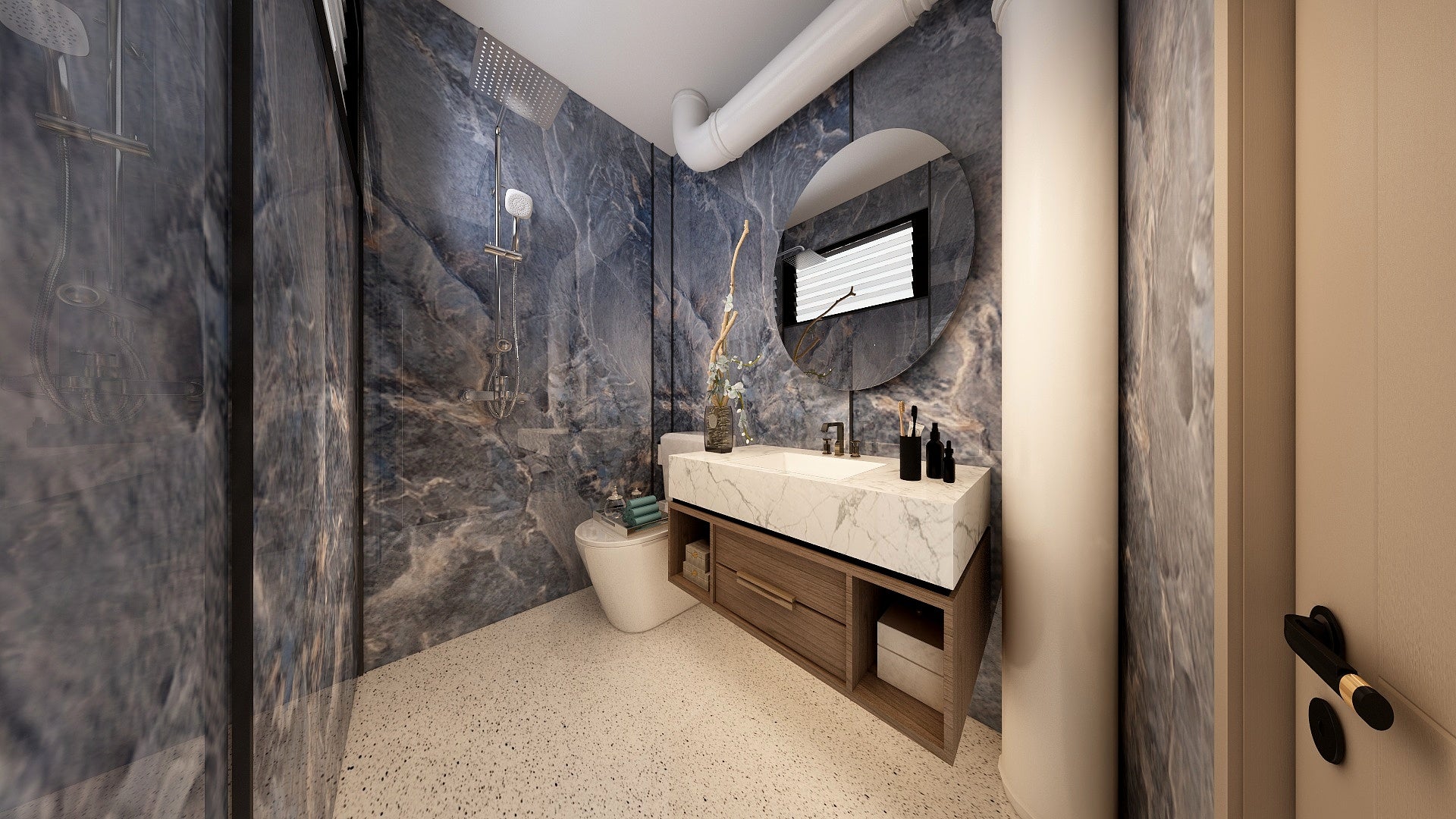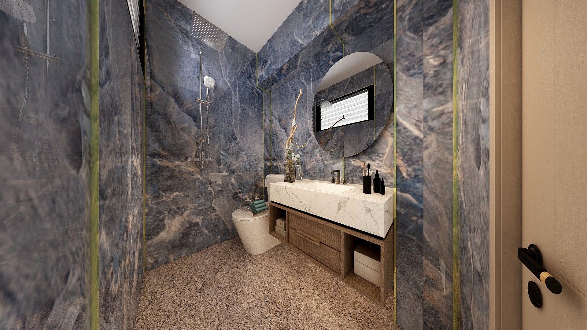 The Wall are a composite slabs manufactured under extreme environments, under high pressures of up to 700,000kgf/mΒ² and temperatures of 220Β°C. Thus achieving the perfect equilibrium of tensile strength, density and durability to withstand wet area usage like bathroom walls.